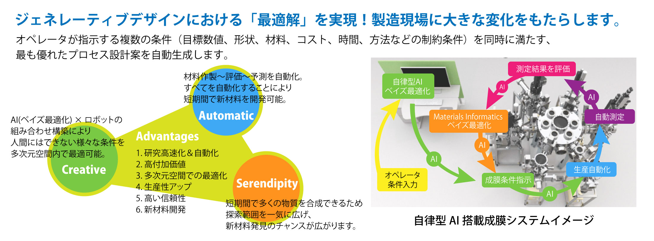 ロボット自らが物性評価・条件および組成の最適化の判断を行い、物質合成を行う。AIとロボット技術を駆使したジェネレーティブデザインで「革新的な最適解」を導きます。それがセレンディピティ(予想外の発見)をも生み出します。