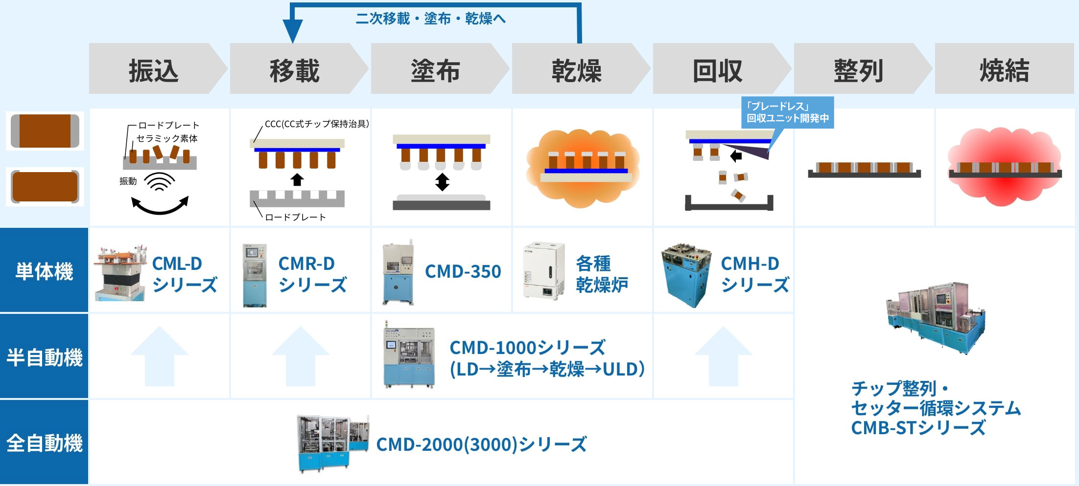 MLCC/MLCI/バリスタ/サーミスなど受動部品における次世代誘電体シート成形、内部電極⼯程、両端⼦‧多端⼦の外部電極塗布及び塗布前後⼯程に関するプロセス技術‧装置‧治具‧受託サービスをご提供。世界最⼩サイズ0201mm〜等、弊社の特許技術‧ユニークなプロセス技術がお客様のご要望にお応えします。